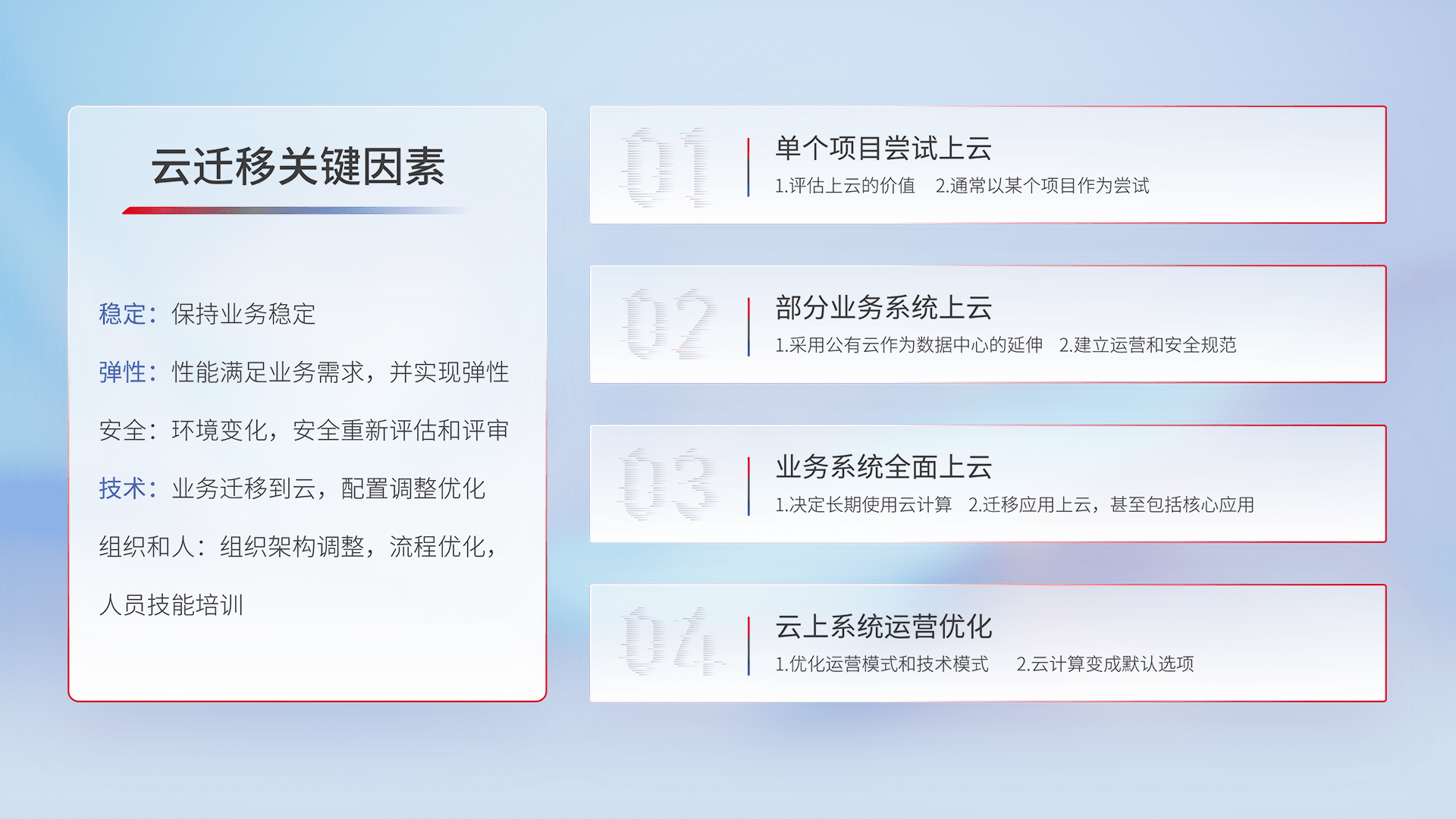 结合实际业务,,,从规划设计、、云平台选型、、、、云原生改造、、数据迁移、、、集成交付,,迁移全过程为客户识别最佳上云路径,,,,做好风险识别管理,,,,设计网络架构、、、、身份权限、、、安全审计合规、、、、操作审计、、、日志审计、、监控告警策略、、、、多站点容灾设计等,,对云上基础设施进行整体规划,,,提升IT治理水平,,,,以满足弹性、、、、高可用、、高性能的需求。。