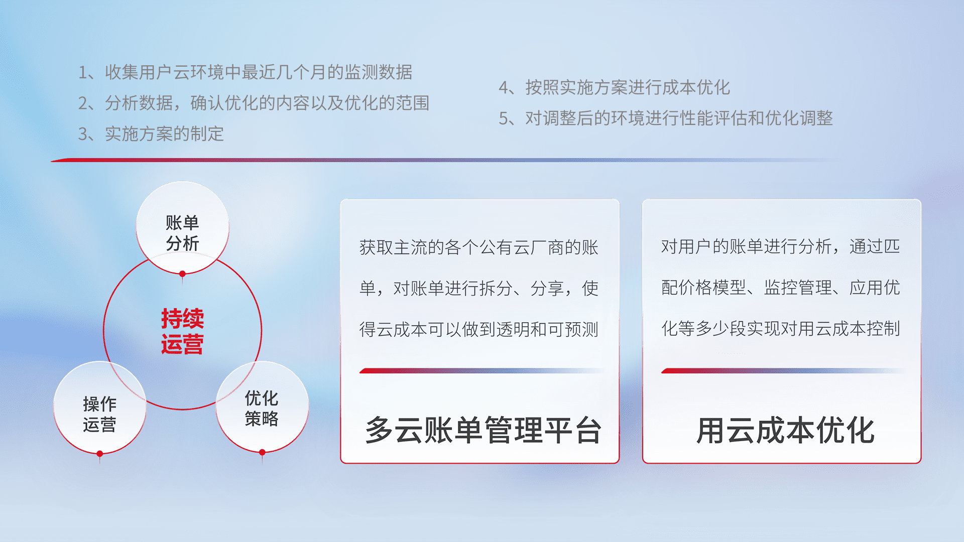通过多云纳管,,,以统一的资源数据模型把客户的云资源进行抽象和封装,,,进而实现对多云资源的统一操作,,保障云资源管理的可靠性、、稳定性与可用性。。量身定制化运维内容,,,,配置、、、开发运维、、、、补丁管理、、备份、、、监控、、、认证和访问管理、、、审计和日常巡检等,,,保障在用云过程中的可靠度,,,,稳定度以及高可用率。。。。